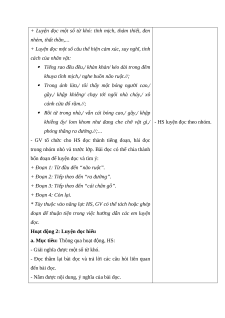 ấm, hơi buồn; nhấn giọng ở những từ ngữ chỉ hoạt - HS luyện đọc theo hướng