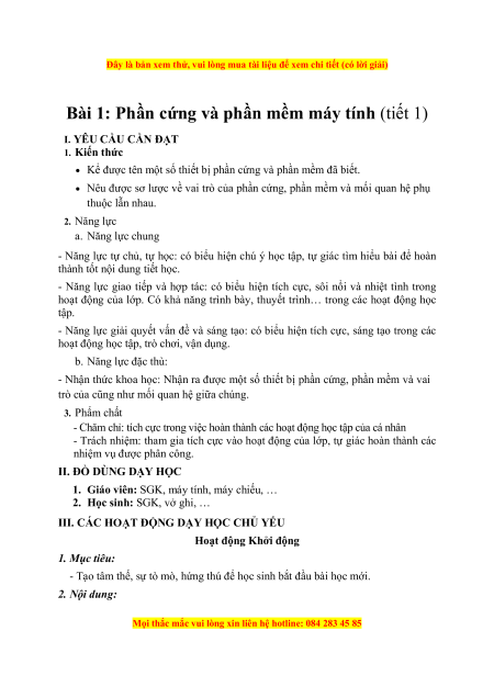 HS nhận ra và kể tên được một số thiết bị phần cứng và phần mềm. 2. Nội dung