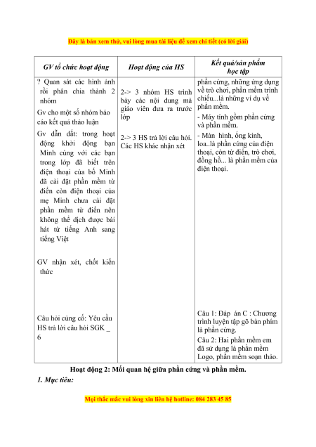 Hoạt động 1: Phần cứng và phần mềm 1. Mục tiêu: