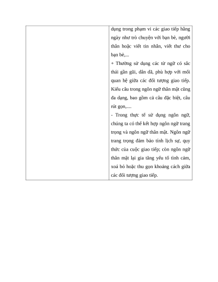 - Phân biệt và biết cách sử dụng ngôn ngữ trang trọng, ngôn ngữ thân mật trong giao tiếp.