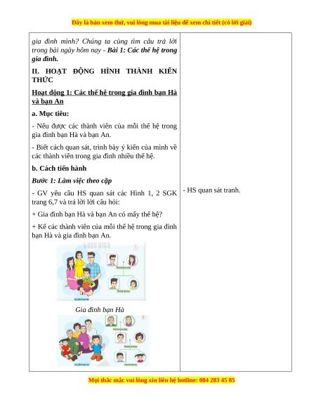 Hoạt động 1: Các thế hệ trong gia đình bạn Hà và bạn An a. Mục tiêu: