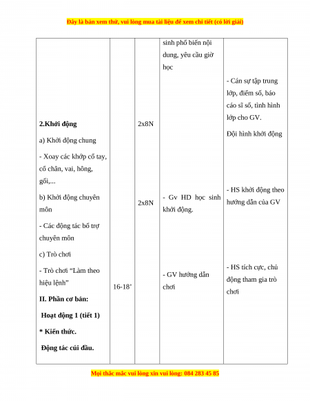 sinh phổ biến nội dung, yêu cầu giờ học - Cán sự tập trung lớp, điểm số, báo cáo sĩ số, tình hình lớp cho GV. 2.Khởi động 2x8N Đội hình khởi động a) Khởi động chung - Xoay các khớp cổ tay, cổ chân, vai, hông, gối,... - HS khởi động theo b) Khởi động chuyên - Gv HD học sinh 2x8N hướng dẫn của GV môn khởi động.