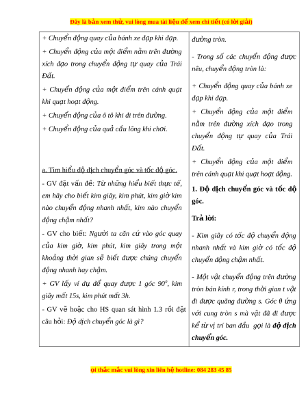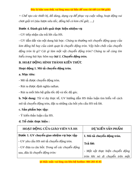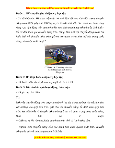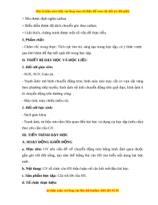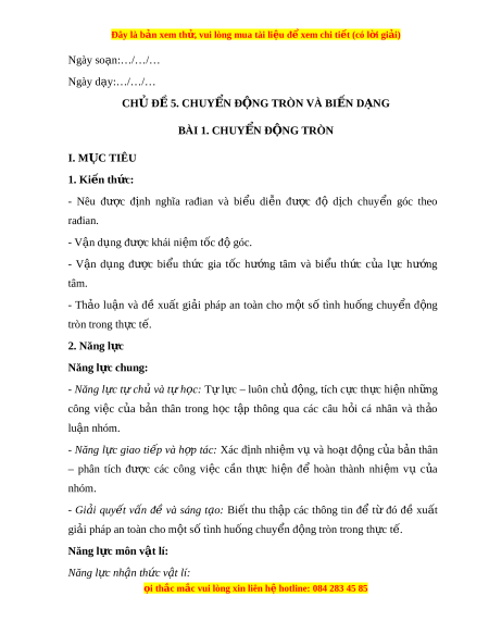 Đây là bản xem th , vu ử i lòng mua tài li u ệ đ xe ể m chi ti t (c ế ó l i ờ gi i ả ) Ngày so n: ạ …/…/… Ngày d y: ạ …/…/… CH Đ Ủ Ề 5. CHUY N Ể Đ N Ộ G TRÒN VÀ BI N Ế D N Ạ G BÀI 1. CHUY N Ể Đ N Ộ G TRÒN I. M C Ụ TIÊU 1. Ki n t ế h c ứ : - Nêu đư c ợ đ nh ị nghĩa rađian và bi u ể di n ễ đư c ợ độ d ch ị chuy n ể góc theo rađian. - V n d ậ ng ụ đư c khái ợ ni m ệ tốc đ góc. ộ - V n ậ d ng ụ đư c ợ bi u ể th c ứ gia t c ố hư ng ớ tâm và bi u ể th c ứ c a ủ l c ự hư ng ớ tâm. - Th o ả lu n ậ và đề xu t ấ gi i ả pháp an toàn cho m t ộ số tình hu ng ố chuy n ể đ ng ộ tròn trong th c t ự . ế 2. Năng l c ự Năng l c ự chung: - Năng l c ự t ự ch ủ và t ự h c: ọ T ự l c ự – luôn ch ủ đ ng, ộ tích c c ự th c ự hi n ệ nh ng ữ công vi c ệ c a ủ b n ả thân trong h c ọ t p ậ thông qua các câu h i ỏ cá nhân và th o ả lu n nhóm ậ . - Năng l c ự giao ti p ế và h p ợ tác: Xác đ nh ị nhi m ệ v ụ và ho t ạ đ ng ộ c a ủ b n ả thân – phân tích đư c ợ các công vi c ệ c n ầ th c ự hi n ệ để hoàn thành nhi m ệ vụ c a ủ nhóm. - Gi i ả quy t ế v n
