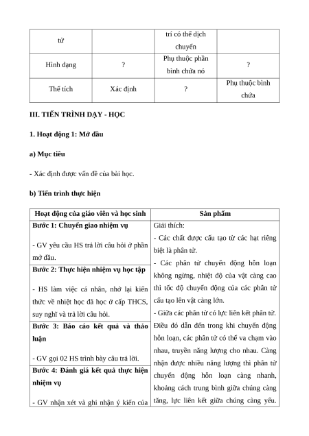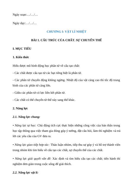 Giáo án Bài 1 Vật Lí 12 Kết nối tri thức (2025): Cấu trúc của chất. Sự chuyển thể