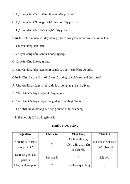 + Phiếu học tập 2 (in trên giấy A4) PHIẾU HỌC TẬP 2 Đặc điểm Chất rắn Chất lỏng Chất khí Xa hơn khoảng Khoảng cách giữa Rất lớn so với kích ? cách giữa các phân các phân tử thước phân tử tử chất rắn Liên kết giữa các Rất mạnh ? Rất yếu phân tử Chuyển động phân ? Dao động quanh vị ? trí có thể dịch tử chuyển Phụ thuộc phần Hình dạng ? ? bình chứa nó Phụ thuộc bình Thể tích Xác định ? chứa