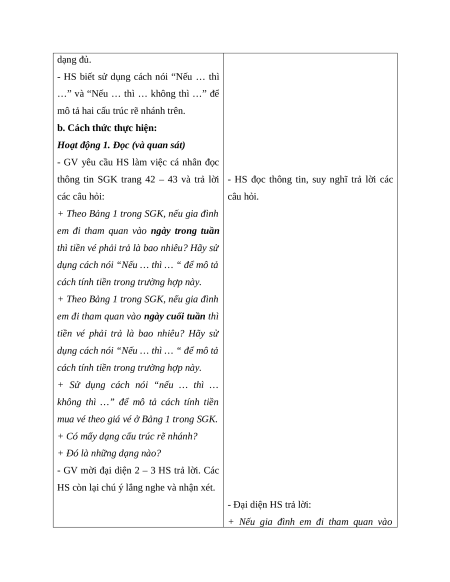b. Bảng 1 là giá vé tham quan trong ngày trong tuần thì chương trình ở Hình