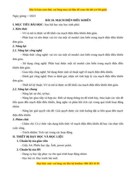 - Năng lực giải quyết vấn đề: Giải quyết được các tình huống đặt ra liên quan đến mạch điện điều khiển. 3. Phẩm chất