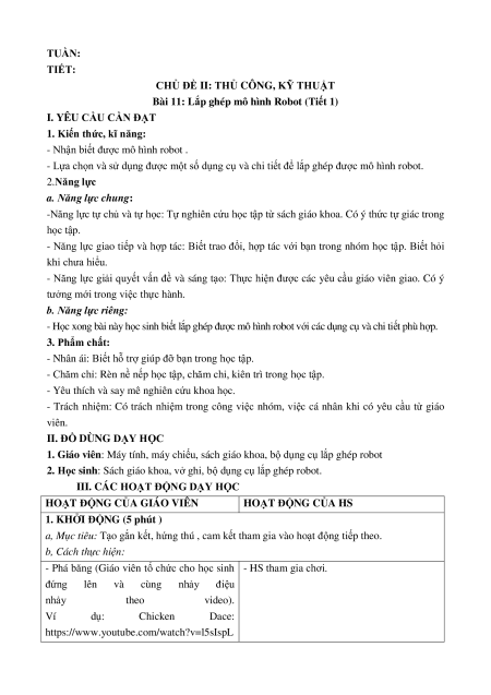 2. Học sinh: Sách giáo khoa, vở ghi, bộ dụng cụ lắp ghép robot.