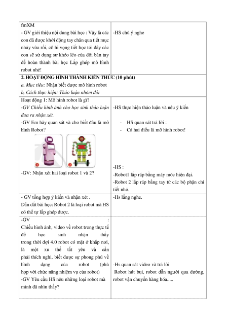 Giáo án Bài 10 Công nghệ lớp 4 Cánh diều: Lắp ghép mô hình robot
