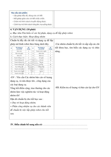 -GV : Để lắp được robot hoàn chỉnh thì việc - Chuẩn bị đầy đủ dụng cụ bộ phận.