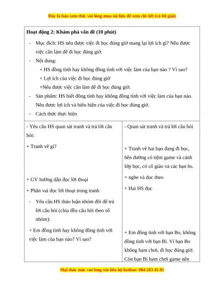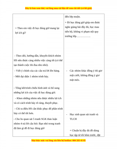 - Mục đích: HS nêu được việc đi học đúng giờ mang lại lợi ích gì? Nêu được
