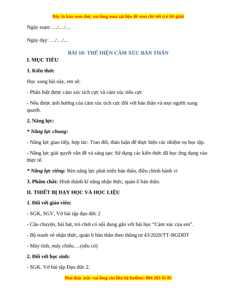 BÀI 10: THỂ HIỆN CẢM XÚC BẢN THÂN I. MỤC TIÊU 1. Kiến thức Học xong bài này, em sẽ: