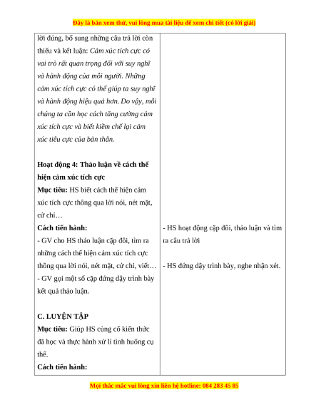 Hoạt động 2: Phân biệt cảm xúc tích cực và tiêu cực