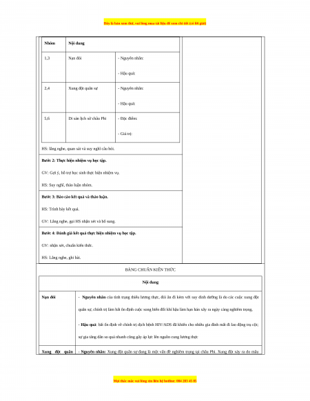 Nhóm Nội dung 1,3 Nạn đói - Nguyên nhân: - Hậu quả: 2,4 Xung đột quân sự - Nguyên nhân: - Hậu quả: 5,6 Di sản lịch sử châu Phi - Đặc điểm: - Giá trị:
