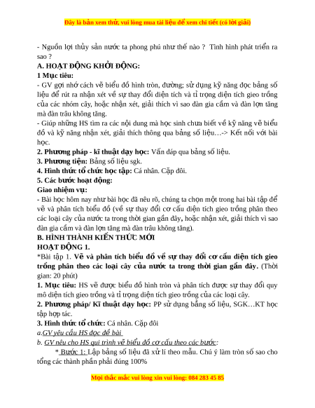 ấ ( hình tròn ) và kĩ năng vẽ bi u ể đồ đư ng ờ th hi ể n t ệ c đ ố ộ tăng trư ng. ở - Rèn luy n kĩ ệ năng đ c ọ bi u đ ể , r ồ út ra nh n xét ậ và gi i ả thích. 3. Thái độ : - Ý th c s ứ ự cần thi t ế ph i ả th t ậ c n t ẩ h n ậ khi tính toán và v bi ẽ u đ ể . ồ 4. Đ nh h ị ư ng phá ớ t tri n năng l ể c ự - Năng l c ự chung: T h ự c, ọ gi i ả quy t ế v n ấ đ , t ề ính toán, h p ợ tác, t duy ư , năng l c ự đ c ọ hi u văn b ể n ả - Năng l c ự chuyên bi t ệ : Tư duy t ng ổ h p ợ theo lãnh th , ổ sử d ng ụ b n ả đ , ồ sử d ng s ụ ố li u t ệ hống kê, sử d ng hì ụ nh vẽ II. CHUẨN BỊ C A Ủ GIÁO VIÊN VÀ H C Ọ SINH : 1. Đ i ố v i ớ giáo viên : - B ng ả số li u s ệ gk 2. Đ i ố v i ớ h c s ọ inh : - Sách giáo khoa, v , ở đồ dùng h c ọ t p ậ (Com pa, thư c ớ k , ẻ thư c ớ đo đ , ộ máy tính b t ỏ úi, ph n m ấ àu, b ng ả ph ) ụ . III. TỔ CH C Ứ CÁC HO T Ạ Đ N Ộ G H C Ọ T P Ậ : 1. n đ Ổ nh l ị p ớ : (1 phút) 2. Ki m ể tra bài cũ : - Vai trò c a ủ ngành lâm nghi p ệ trong vi c ệ phát tri n ể kinh tế và b o ả vệ môi trư ng ờ M i ọ thắc m c