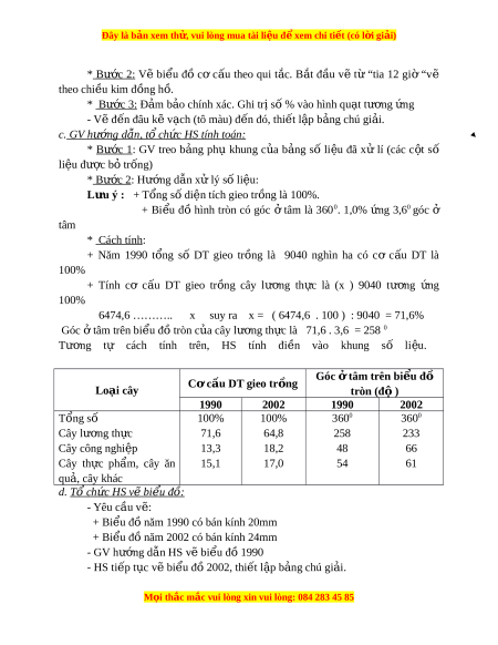 tự cách tính trên, HS tính đi n ề vào khung số li u. ệ Góc t ở âm trên bi u đ ể ồ ơ ấ ồ Loạ C c u DT gieo tr ng i cây tròn (đ ) ộ 1990 2002 1990 2002 T ng s ổ ố 100% 100% 3600 3600 Cây lư ng t ơ h c ự 71,6 64,8 258 233 Cây công nghi p ệ 13,3 18,2 48 66 Cây th c ự ph m ẩ , cây ăn 15,1 17,0 54 61 qu , ả cây khác d. Tổ ch c H ứ S vẽ bi u đ ể ồ: - Yêu c u v ầ : ẽ + Bi u ể đ năm ồ 1990 có bán kính 20mm + Bi u ể đ năm ồ 2002 có bán kính 24mm - GV hư ng d ớ n H ẫ S v bi ẽ u ể đ 1990 ồ - HS ti p t ế c v ụ bi ẽ u đ ể 2002, t ồ hi t ế l p b ậ ng chú ả gi i ả . M i ọ thắc m c