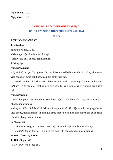 BÀI 10: EM NHẬN DIỆN BIỂU HIỆN XÂM HẠI (3 tiết)