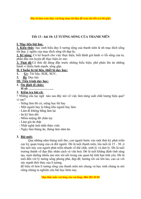 Tiết 13 - bài 10: LÍ TƯỞNG SỐNG CỦA THANH NIÊN I. Mục tiêu bài học.