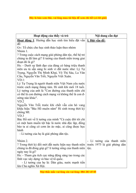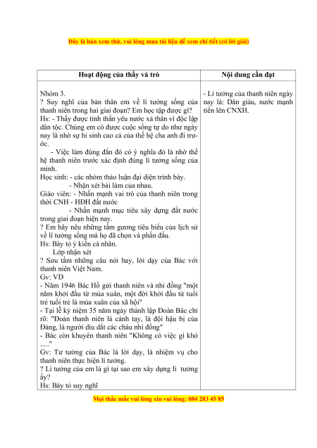 1. Kiến thức: học sinh hiểu đợc lí tưởng sống của thanh niên là nh mục đích sống