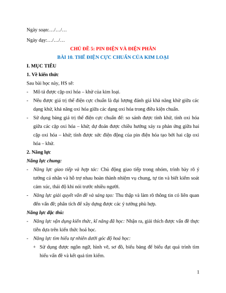 BÀI 10. THẾ ĐIỆN CỰC CHUẨN CỦA KIM LOẠI I. MỤC TIÊU 1. Về kiến thức Sau bài học này, HS sẽ: