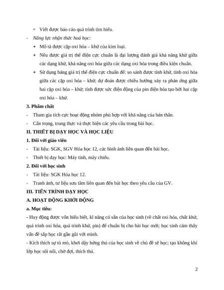 hai cặp oxi hóa – khử; tính được sức điện động của pin điện hóa tạo bởi hai cặp oxi hóa – khử. 3. Phẩm chất