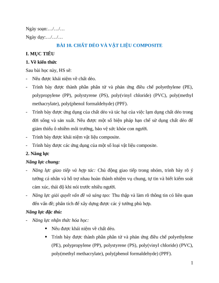 BÀI 10. CHẤT DẺO VÀ VẬT LIỆU COMPOSITE I. MỤC TIÊU 1. Về kiến thức Sau bài học này, HS sẽ: