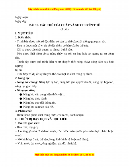 BÀI 10: CÁC THỂ CỦA CHẤT VÀ SỰ CHUYỂN THỂ (3 tiết) I. MỤC TIÊU 1. Kiến thức