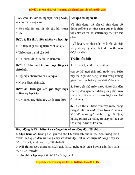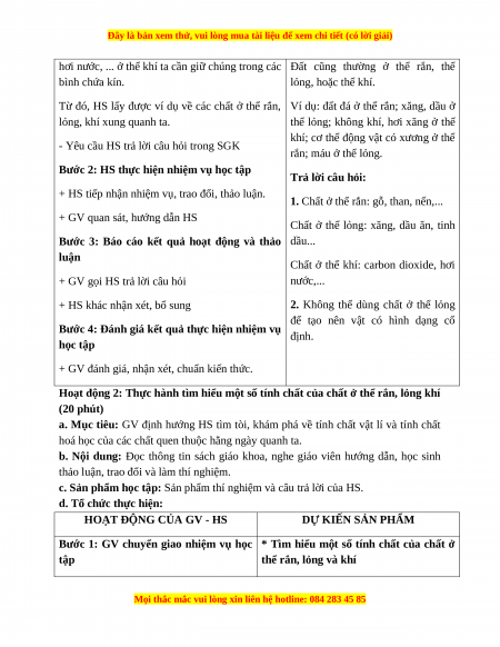 Hoạt động 2: Thực hành tìm hiểu một số tính chất của chất ở thể rắn, lỏng khí (20 phút)
