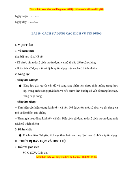 BÀI 10: CÁCH SỬ DỤNG CÁC DỊCH VỤ TÍN DỤNG I. MỤC TIÊU 1. Về kiến thức Sau bài học này, HS sẽ: