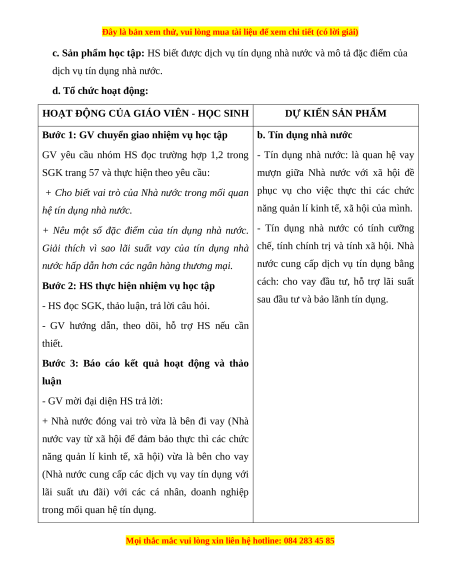 c. Sản phẩm học tập: HS biết được dịch vụ tín dụng nhà nước và mô tả đặc điểm của
