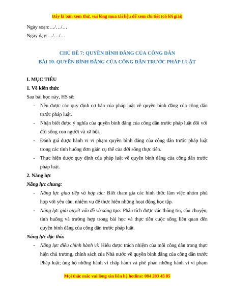BÀI 10. QUYỀN BÌNH ĐẲNG CỦA CÔNG DÂN TRƯỚC PHÁP LUẬT I. MỤC TIÊU 1. Về kiến thức Sau bài học này, HS sẽ: