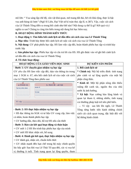 a. Mục tiêu: Trình bày được bối cảnh lịch sử cuộc cải cách của vua Lê Thánh Tông