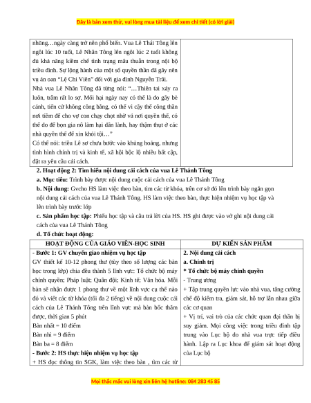 nội dung cải cách của vua Lê Thánh Tông. HS làm việc theo bàn, thực hiện nhiệm vụ học tập và