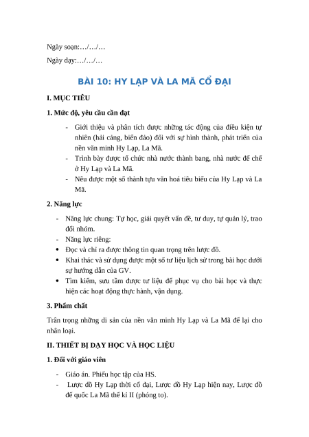 BÀI 10: HY LẠP VÀ LA MÃ CỔ ĐẠI I. MỤC TIÊU