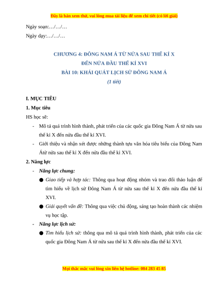 BÀI 10: KHÁI QUÁT LỊCH SỬ ĐÔNG NAM Á (1 tiết) I. MỤC TIÊU 1. Mục tiêu HS học sẽ: