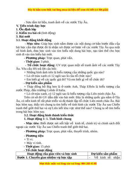 ể tra bài cũ (linh đ ng) ộ 3. Bài m i ớ 3.1. Hoạt đ ng k ộ h i ở đ ng ộ - M c ụ tiêu: Giúp h c ọ sinh n m ắ đư c ợ các n i ộ dung c ơ b n ả bư c ớ đ u ầ c a ủ bài h c ọ c n ầ đ t ạ đư c ợ đó là nh n ậ xét đư c ợ s ơ lư c ợ v ề các nư c ớ Tây Âu qua m t ộ số hình nh, ả đ a ư h c ọ sinh vào tìm hi u ể n i ộ dung bài h c, ọ t o ạ tâm thế cho h c ọ sinh đi vào tìm hi u bài ể m i ớ . - Phư ng pháp ơ : Tr c quan, phát ự vấn. - Th i ờ gian: 3 phút. - Tổ ch c ứ ho t ạ đ ng ộ : GV tr c ự quan m t ộ số tranh nh ả về các nư c ớ Tây Âu. Yêu cầu HS tr l ả i ờ câu h i ỏ : + Nh ng hì ữ nh nh ả trên là bi u t ể ư ng c ợ a ủ nh ng qu ữ c ố gia nào? + Lá c m