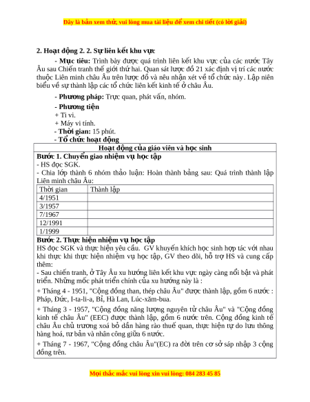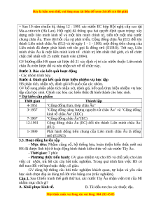 ộ Liên minh châu Âu trên lư c ợ đ ồ và nêu nh n ậ xét v ề t ổ ch c ứ này. L p ậ niên bi u v ể ề s t ự hành l p ậ các tổ ch c l ứ iên k t ế kinh t ế ở châu Âu. - Phư ng pháp ơ : Tr c quan, phát ự vấn, nhóm. - Phư ng t ơ i n ệ + Ti vi. + Máy vi tính. - Th i ờ gian: 15 phút. - T ch ổ ức ho t ạ đ ng ộ Hoạt đ ng c ộ a g ủ iáo viên và h c ọ sinh Bư c ớ 1. Chuy n gi ể ao nhi m ệ v h ụ c ọ t p ậ - HS đ c ọ SGK. - Chia l p ớ thành 6 nhóm th o ả lu n: ậ Hoàn thành b ng