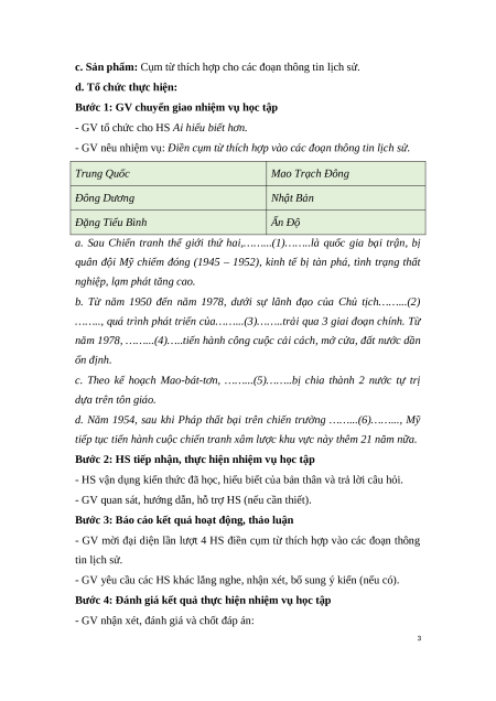 - GV nêu nhiệm vụ: Điền cụm từ thích hợp vào các đoạn thông tin lịch sử. Trung Quốc Mao Trạch Đông Đông Dương Nhật Bản Đặng Tiểu Bình Ấn Độ