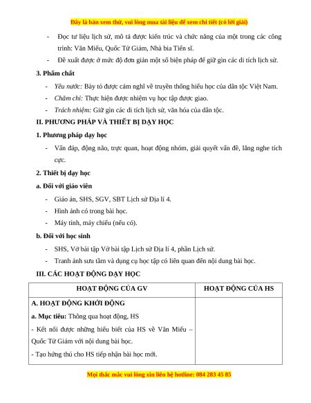 Giáo án Bài 10 Lịch sử & Địa lí lớp 4 Cánh diều: Văn Miếu - Quốc Tử Giám