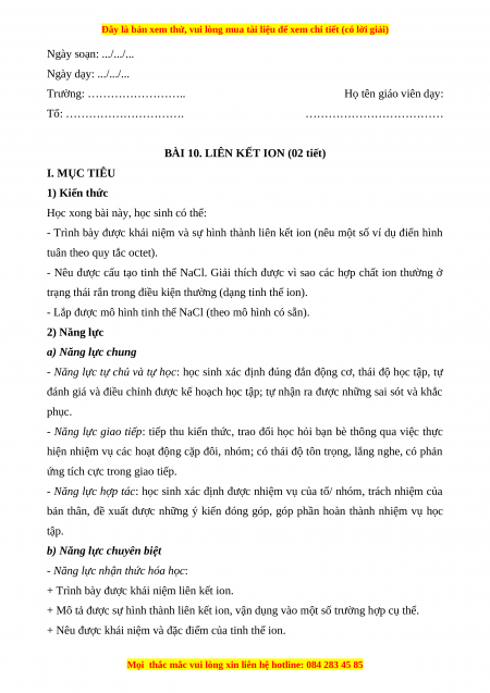 BÀI 10. LIÊN KẾT ION (02 tiết) I. MỤC TIÊU 1) Kiến thức
