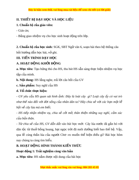 ộ về cây lúa mà em bi t ế . - HS ti p ế nh n ậ nhi m ệ v , ụ chia sẻ c i ở m , ở thân thi n ệ nh ng ữ suy nghĩ, c m ả xúc c a ủ b n t ả hân. - Từ chia sẻ c a ủ HS, GV d n ẫ d t ắ vào bài h c ọ m i ớ : Cây lúa nư c ớ đã g n ắ bó v i ớ dân t c ộ từ thuở h ng ồ hoang, h t ạ ng c ọ tr i ờ đã nuôi dư ng ỡ bi t ế bao thế h . ệ V y ậ , qua lễ cúng th n ầ lúa c a ủ ngư i ờ Chơ -ro mu n ố thể hi n ệ đi u ề gì? Bài h c ọ hôm nay chúng ta cùng tìm hi u. ể B. HOẠT Đ N
