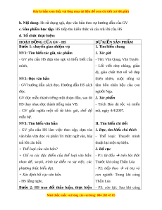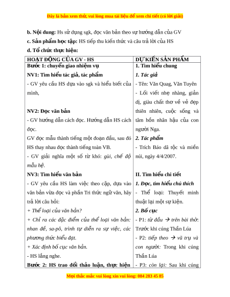 ộ dung: Hs sử d ng s ụ gk, đ c văn b ọ n ả theo sự hư ng d ớ n c ẫ a G ủ V c. Sản phẩm h c t ọ p: ậ HS ti p t ế hu ki n t ế h c và ứ câu tr l ả i ờ c a ủ HS d. T ch ổ ức thực hi n: ệ HOẠT Đ N Ộ G C A Ủ GV - HS D K Ự IẾN SẢN PH M Ẩ Bư c ớ 1: chuy n gi ể ao nhi m ệ vụ 1. Tìm hi u chung ể NV1: Tìm hi u t ể ác gi , t ả ác ph m ẩ 1. Tác giả - GV yêu c u ầ HS d a ự vào sgk và hi u ể bi t ế c a ủ - Tên: Văn Quag, Văn Tuyên mình, - L i ố vi t ế nhẹ nhàng, gi n ả dị, giàu ch t ấ thơ về vẻ đ p ẹ NV2: Đ c ọ văn bản thiên nhiên, cu c ộ s ng ố và - GV hư ng ớ d n ẫ cách đ c ọ . Hư ng ớ d n ẫ HS cách tâm h n ồ nhân h u ậ c a ủ con đ c. ọ ngư i ờ Nga. GV đ c ọ m u ẫ thành ti ng ế m t ộ đo n ạ đ u,