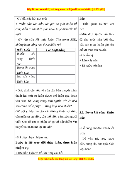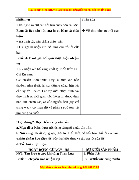 Đây là bản xem th , vu ử i lòng mua tài li u ệ đ xe ể m chi ti t ế (có l i ờ gi i ả ) nhi m ệ vụ Th n L ầ úa + HS nghe và đ t ặ câu h i ỏ liên quan đ n bài ế h c ọ Bư c ớ 3: Báo cáo k t ế quả ho t ạ đ ng ộ và th o ả VB theo trình t t ự h i ờ gian luận + HS trình bày s n ả ph m ẩ th o ả lu n ậ + GV g i ọ hs nh n