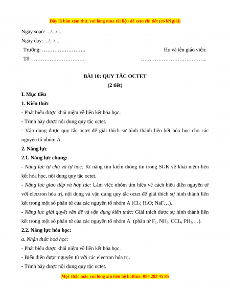 BÀI 10: QUY TẮC OCTET (2 tiết) I. Mục tiêu 1. Kiến thức