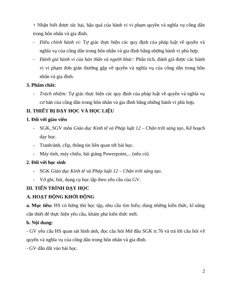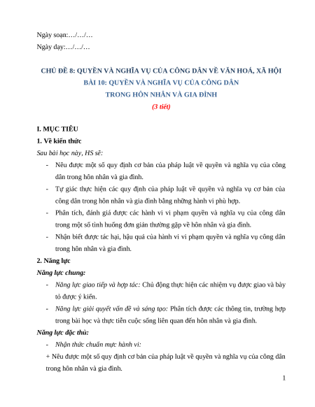 Giáo án Bài 10: Quyền và nghĩa vụ của công dân trong hôn nhân và gia đình KTPL 12 Chân trời sáng tạo