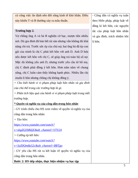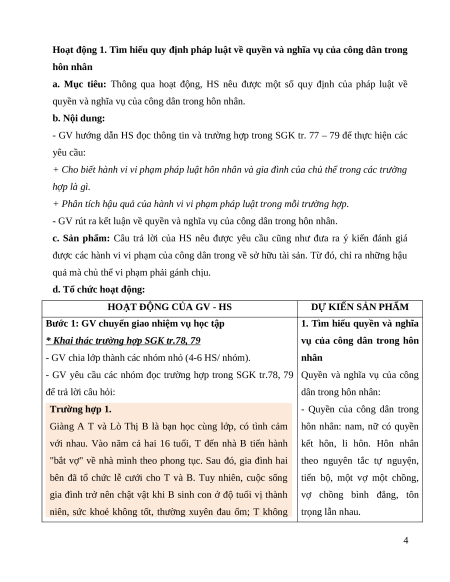 - GV yêu cầu các nhóm đọc trường hợp trong SGK tr.78, 79 Quyền và nghĩa vụ của công để trả lời câu hỏi: dân trong hôn nhân: Trường hợp 1.