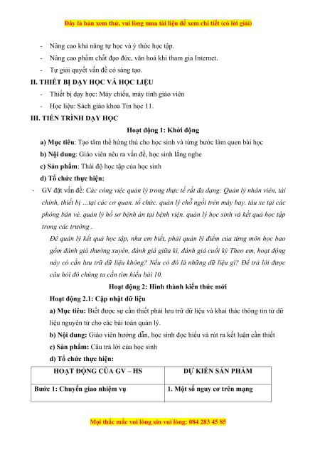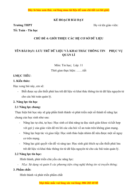 TÊN BÀI DẠY: LƯU TRỮ DỮ LIỆU VÀ KHAI THÁC THÔNG TIN PHỤC VỤ QUẢN LÍ Môn: Tin học; Lớp: 11
