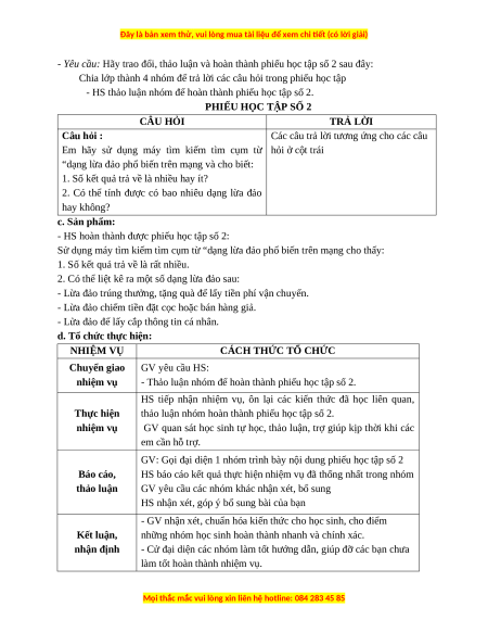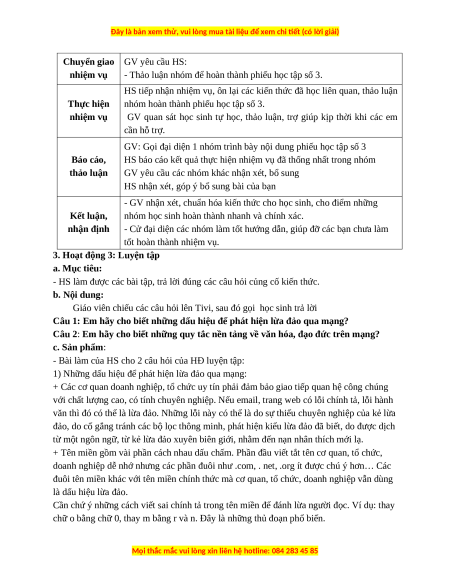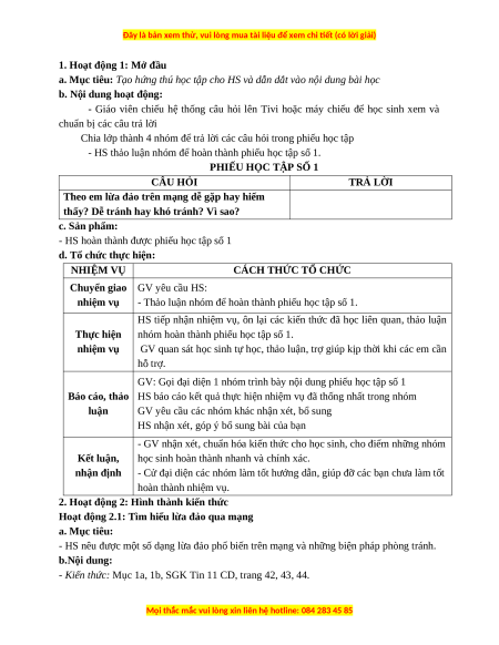 - HS nêu được một số dạng lừa đảo phổ biến trên mạng và những biện pháp phòng tránh. b.Nội dung:
