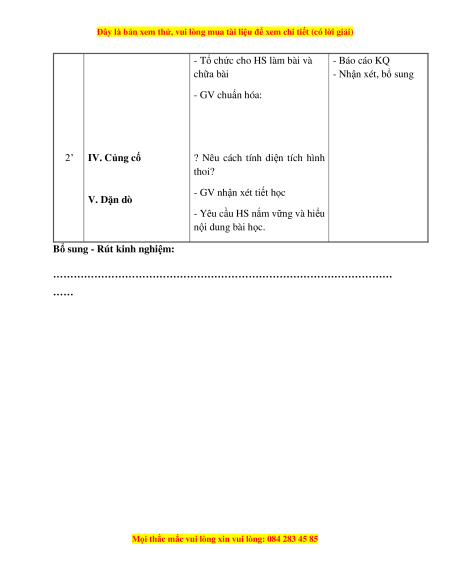 - Tổ chức cho HS làm bài và - Báo cáo KQ chữa bài - Nhận xét, bổ sung - GV chuẩn hóa: 2’ IV. Củng cố