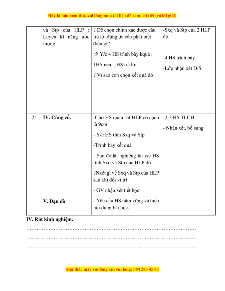 -Củng cố công thức tính Sxq và Stp của HLP 2. Kĩ năng